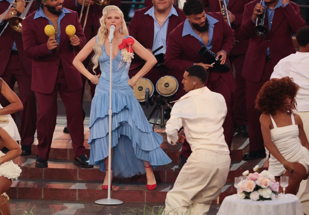 Zara also revealed that they designed Bad Bunny’s backup dancers, showcasing the brands clothing throughout the halftime show. In addition, Lady Gaga made an appearance wearing a light blue flamenco dress, accented with red and white floral brooch detailing on the shoulder, referencing Puerto Rico’s signature flower. The delicate yet bold detail added a soft yet striking element to the look and the performance, serving as a subtle tribute that celebrated love and appreciation for Puerto Rico. Both looks were styled by Storm Pablo and Marvin Douglas Linares, highlighting a cohesive styling vision that balanced bold performance energy with thoughtful fashion storytelling.