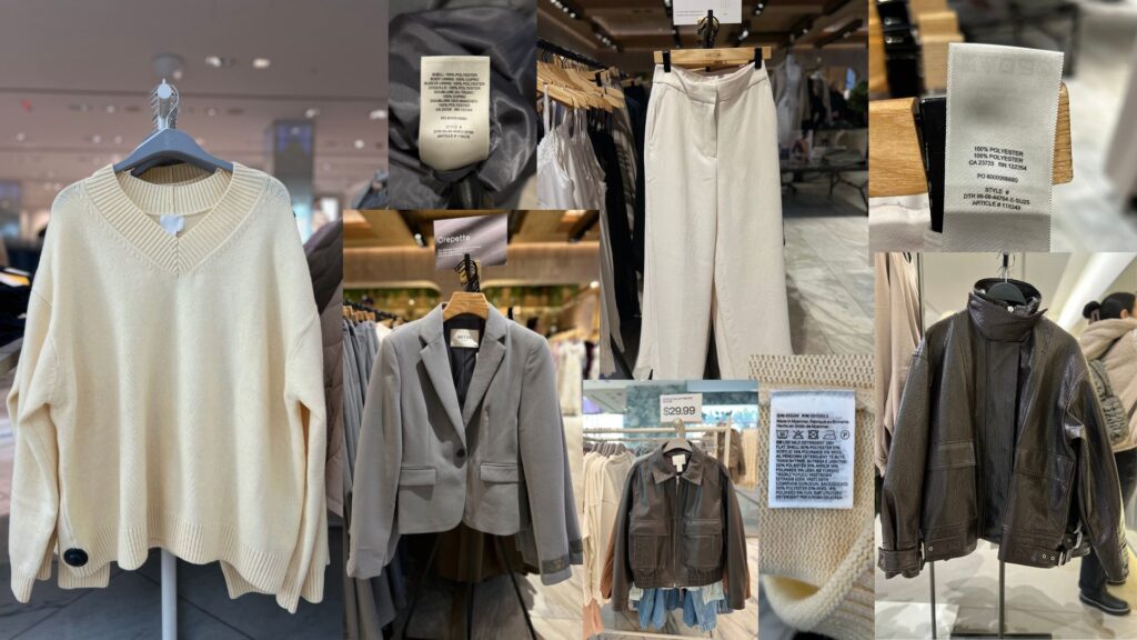 To be fair, both brands do carry pieces made from natural fibers or blended fabrics. However, the broader concern lies in items such as “leather” jackets made from 100% polyester or other synthetic combinations being sold in the $100–$200 range. The disconnect between material and price is difficult to ignore.