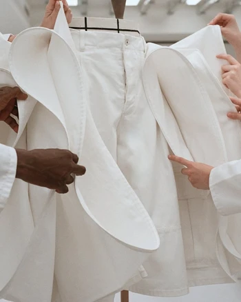 He reimagined this iconic detail by incorporating the same layered fabric technique into men’s shorts, creating a voluminous and eye-catching silhouette on the side.